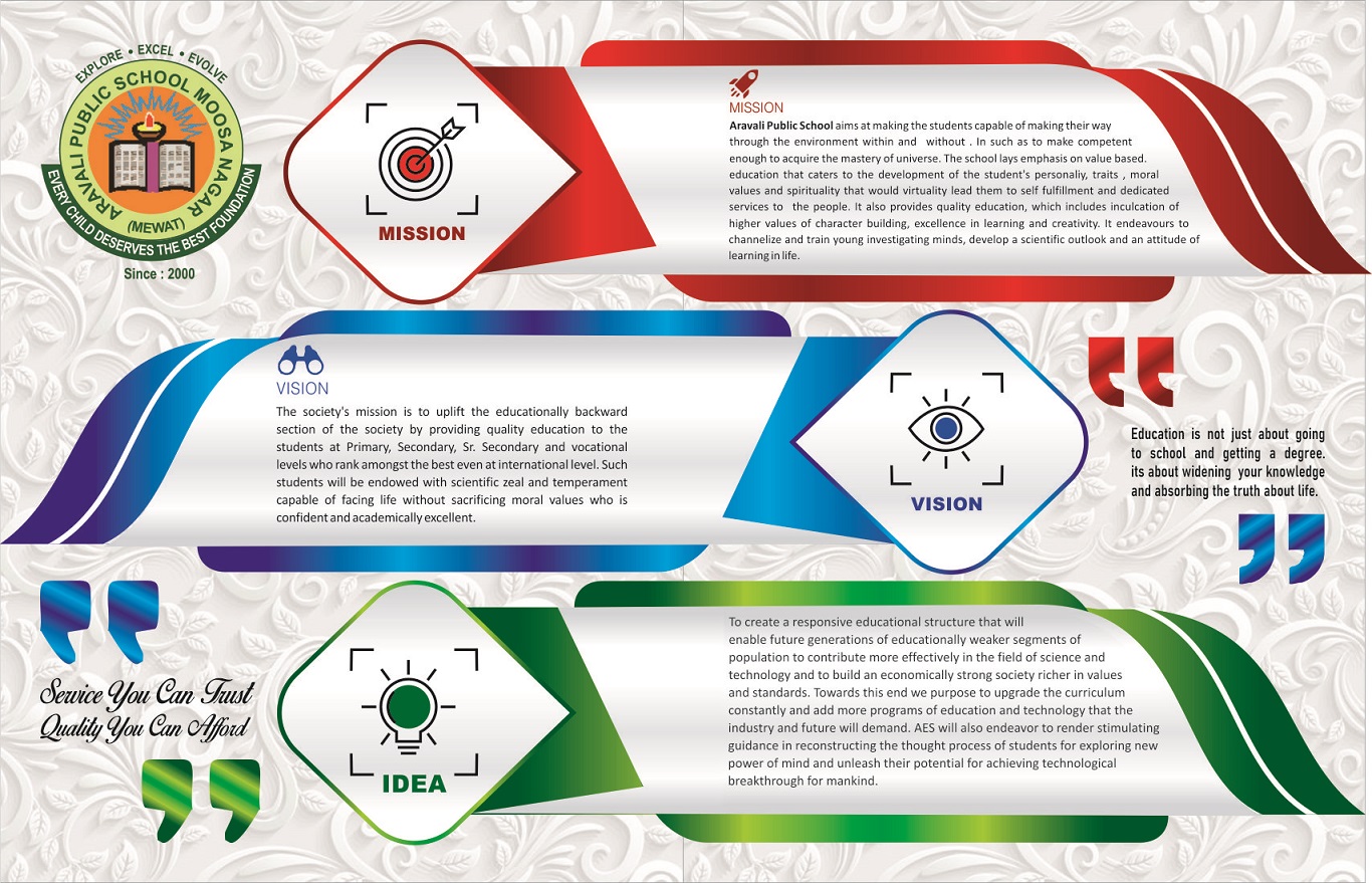 The society's mission is to uplift the educationally backward section of the society by providing quality education to the studentsat Primary, Secondary, Sr. Secondary and vocational levels who rank amongst thebest even at international level. Such students will be endowed with scientificzeal and temperament capable of facing life without sacrificing moral valueswho is confident and academically excellent.